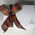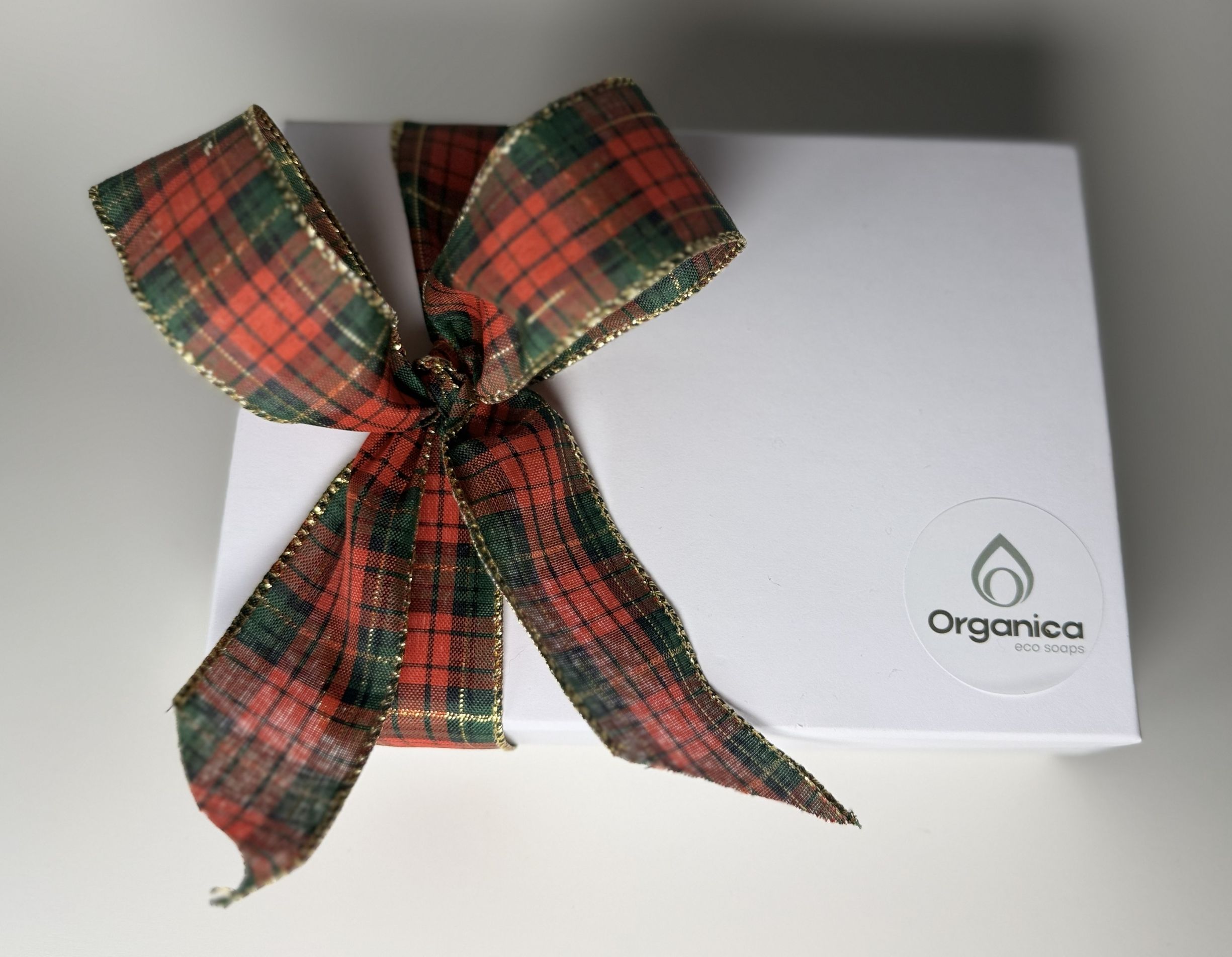 A selection of 3 of our premium soaps, in a White Paper/ cardboard gift box with a red ribbon cross bow.